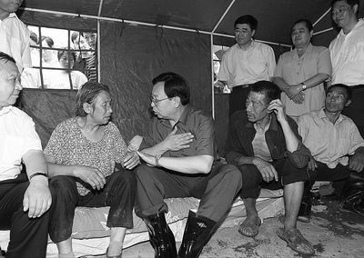 在14号帐篷里,徐光春对52岁的农妇贺秀彩说:“大灾当头,我很不放心。我们专程看望你们来了……”