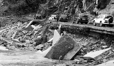 窗外,在公路急转弯处,洪灾仿佛故意伸出魔掌,常常掏空路基,使得路面下的石子等填充底料荡然无存;或用莽撞无情的魔杖敲掉整块整块的路面,坠落在路侧河道里;峭壁落石则滚落下来,堆积阻挡在道路中间。沿途,各种装载机、挖掘机、铲车等大型工程机械正吃力地在路面或河床里施工,抢修道路。