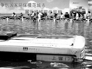 2007年8月2日,一场特大暴雨袭击郑州。图为郑州市紫荆山路陇海路桥下的积水,一辆公交车几乎被淹没,所幸车上的人员在淹前逃离。 沙浪/图