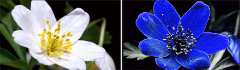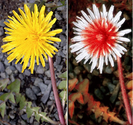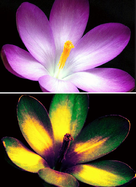生长在河畔沙地上的月见草在人类看来完全是黄色,在昆虫眼中它的中心部位却格外艳丽。同样,蜜蜂看到的蒲公英,其中心与周边也有明显的色彩差异,俗称“白头翁”的银莲花可能变成一片蓝色,而中心的黄色花蕊则会呈现暗黑色。原本紫红叶、黄色蕊的藏红花在紫外光下分出鲜明的三个色区,中间的花蕊部分呈现出很深的红褐色。