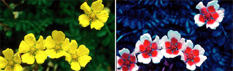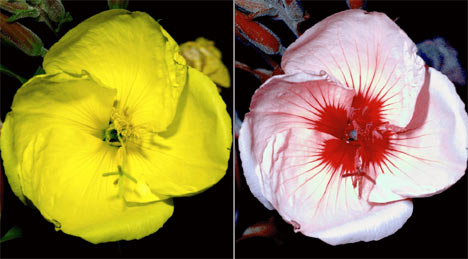 中国日报网环球在线消息:花的颜色是引导昆虫寻花的标志之一。由于视觉光谱不同,昆虫眼中的花朵与人类看来其实完全不同。挪威科学家、摄影家罗斯莱特通过拍摄自然光和紫外光下的对比照片,让我们领略了昆虫看到的神秘色彩世界。