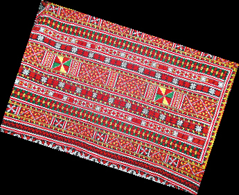 “过山瑶反面刺绣”最大的特点在于:从反面绣,不看正面;绣时不用画底稿,先用黑白线依布纹绣出方格,然后于各格中配入基本图案;常用意象化、象形化的图案构成主要内容,用以构成全幅花纹的基本图案是定型的;线条无弧线,角度有严格限制;花纹颜色有红绿黄黑白五种。