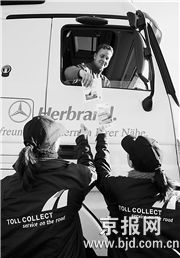 德国高速公路今年开启卫星定位收费系统,对载重货车进行收费。图为收费人员向卡车司机宣传付费方法。