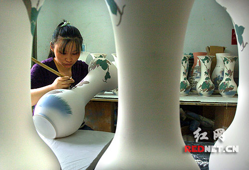 醴陵醴泉窑艺的工人正在描绘釉下彩瓷瓶,陶瓷生产创造的价值约占醴陵国民生产总值的四成。