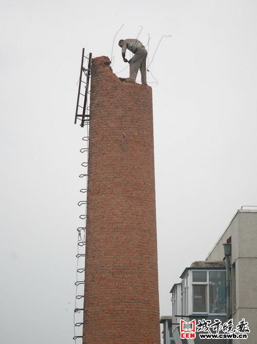 本报讯 “站在烟囱顶上拆烟囱,这太危险了!万一工人一不留神掉下来,后果不堪设想!”8月14日上午,看到一名工人站在20多米高的烟囱顶上挥舞着大铁锤,附近居民不由得担心起来。