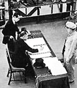 上午9时整,受降仪式正式开始。站在会场里的何其忱能清楚地看到冈村宁次低头看完日本投降书。“写下‘冈村宁次’四字后,他还从上衣口袋内取出一枚图章盖在名字下面,由于手颤抖,冈村宁次把章盖歪了!”不仅室内站满了人,连外头走廊也是人头攒动,而当天日本代表都剃着光头,脸色十分难看,以前那种嚣张跋扈的气焰不见了,最后冈村宁次十分不情愿地交出了随身携带的那把曾沾满中国人鲜血的军刀。