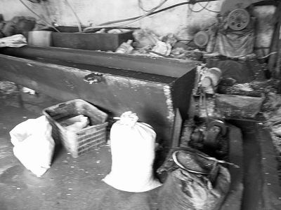 走进厂房,靠东侧堆积的是一袋袋碎料,西侧是粉碎塑料瓶的设备。这个厂子的生产规模比先前暗访的那个碎料厂要大,但是设备和工序大同小异,同样的生锈的搅拌机,同样的污水池。