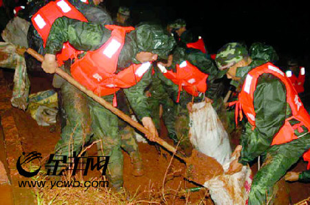 上图:湛江武警支队官兵冒雨支持雷州市抢修水毁工程。袁增伟 段东北 摄影报道