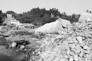 坍塌的大桥桥墩斜卧在沱江峡谷中,碎成几段,可以清楚地看到里面的砖块和水泥,散落一地的脚手架被扭成了麻花状。11台挖掘机、20台铲车正在紧张有序地清理废墟,公安干警带着警犬在废墟中搜寻着生命的气息。