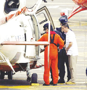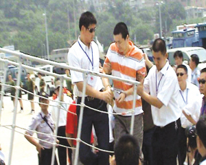 两人戴着手铐,两名劫机犯先后下了车,站在原地一动不动,但是没有讲一句话,面对着码头上的红十字工作人员神情黯然。“就是他们了!把他们押上船!”两岸红十字会工作人员办理完相关交接手续,确认了两名劫机犯的身份后,当即迅速地将其送上“海峡号”遣送船。