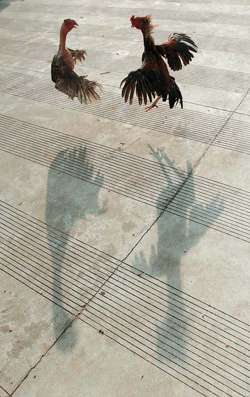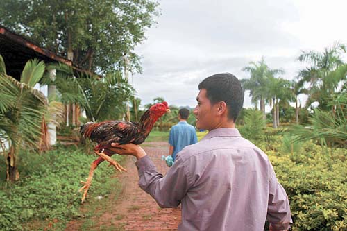 阿香和阿岩都是景洪市橄榄坝曼村的傣族汉子,从小喜爱斗鸡,平时务农,空闲的时候就以斗鸡为乐。和他们一样,村里每户人家都有两到三只斗鸡,只要兴致来了,在马路上、草地上、家门口或菜地里都可以来一场。
