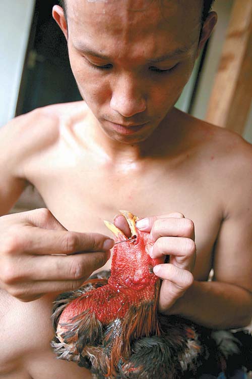 在比赛中,阿香会用冷水给“飞机”降温,并给它的脖子、头脸、翅膀、腿部按摩,使之肌肉发达。如果“飞机”受了伤,阿香会及时用木炭粉末洒在它的伤口上,这是当地人祖传的方法。