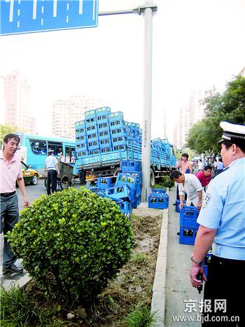 记者赶到现场时,一辆蓝色的大货车骑在马路东侧的绿化带上,车身微微向左侧倾斜,前挡风玻璃完全破碎,车轮下轧着一根长约10米的灯杆。人行道上堆放了七八十个塑料箱,有的箱子是空的,有的则装着啤酒瓶或整瓶啤酒。六七名工作人员正在用笤帚、铁锨清理主路上散落的啤酒瓶碎碴儿;旁边一辆环卫车上装满了玻璃碴儿。8时25分,路面上的玻璃碴儿被清理完毕。