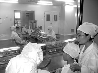 工作人员还告诉我们,药瓶都是经过350度高温灭菌并经过一道道的检验才到分装车间的,洁净要求完全符合GMP标准。药厂每批药品生产结束后,都要对车间进行消毒。对工人的要求包括身体和技术的要求,经过严格的体检,合格才能入场,对于员工,每年要求体检一次。如果工作期间生病,要调离岗位直至病愈。此外,在生产操作区内都设有两条通道,药品等物料的运输都有专门通道,人和药品不能同走一条路。