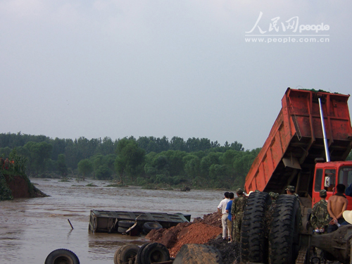 由于水流湍急,河道冲垮处封堵工作遇到很大困难。当地调运了14辆即将报废的卡车载满砂石连车带料一起填入决口处,有的车甚至被冲出10多米远。截至记者发稿时为止,50米的决口已堵住40米左右,预计凌晨能封堵合龙。