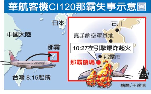 台海网8月20日讯台湾中华航空公司的客机在日本冲绳县那霸机场左引擎发生爆炸,之后机身起火。为什么左边的二号引擎会爆炸起火,将是今后事故调查的种点所在。