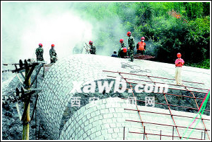消防官兵等在事故现场为爆破解体垮塌桥墩进行准备工作。5天前的黄昏时刻,湖南凤凰县即将竣工的堤溪大桥,在几声巨响后垮塌。顷刻之间,刚刚建成的大桥变成一片烟尘笼罩的废墟,吞噬了数十名农民工的生命。