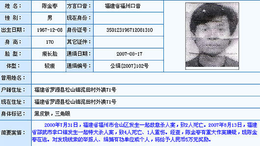 通缉令显示,2000年7月31日,福建省福州市仓山区发生一起故意杀人案,致2人死亡。2007年8月13日,福建省邵武市拿口镇发生一起特大杀人案,致4人死亡、1人重伤。经查,陈金春有重大作案嫌疑,现陈金春在逃。