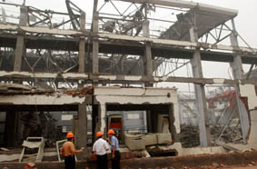 昨天凌晨3时30分左右,记者赶到事发现场,发现车间内已被气流冲得破碎不堪,房顶已被整体掀掉,窗玻璃全部震碎,墙体出现多处明显裂缝。魏桥创业集团副总经理薄其珉介绍,铝母铸造分厂的车间长45米、宽27米,是一座高8米左右的单层建筑。