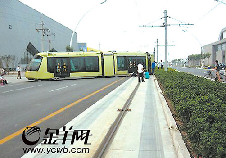 首条导轨电车 出轨横卧街头 金羊网-羊城晚报 2007.08.2114:36 关注 昨日17时左右,在天津滨海新区正式投入载客运营3个多月的中国首条现代导轨电车,冲出了轨道,横卧在马路中央。事故原因正在调查。中新社发 (倩茹/编制)