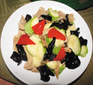 材料:云南小瓜400克,龙川笋干125克,木耳25克,红色尖椒些许,蒜茸,姜茸