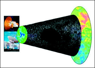 宇宙空洞示意图,左上是WMAP探测器,左下是VLA射电望远镜。美国天文学家日前通过射电望远镜在宇宙中发现了一个直径接近10亿光年的空洞,其中不仅缺少可见的气体、恒星、星系等正常物质,甚至连散布于宇宙中的神秘“暗物质”也难觅踪迹。这个首次被确认的巨型宇宙空洞不禁令天文学家感到无比困惑。