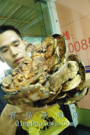 昨天Q友任先生和朋友们一起到崂山去玩,在山林中突然发现一棵大树下靠近根部的地方有一个硕大的灵芝状的东西,赶紧上前摘了下来,任先生很是高兴,朋友们中间有人说这可能是灵芝,任先生拿回家后就把“灵芝”给晒上了。听说灵芝可以预防癌症,任先生还好奇的抠下来一块泡水喝了。