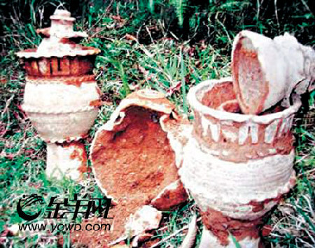 记者昨天赶到该古墓所处的恩平市那吉镇牛山,据居住在附近的村民梁先生介绍,他家本来准备在村头小山边建新屋,当天挖掘小山脚下的泥土。当挖至两米深处时,陆续发现数个陶器,其中有一个已经破碎。他们将陶器表面泥土清理掉,发现陶罐成品字形排列,形状十分奇特,与现在的奖杯有几分相似,顶部还有盖子。