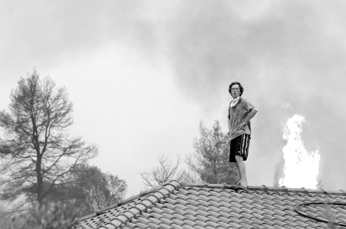 26日,在希腊伯罗奔尼撒半岛南部,一名男子站在屋顶上,面对大火,一脸无奈。据当地电视台报道,截至27日上午,已有63人在火灾中死亡。新华社发