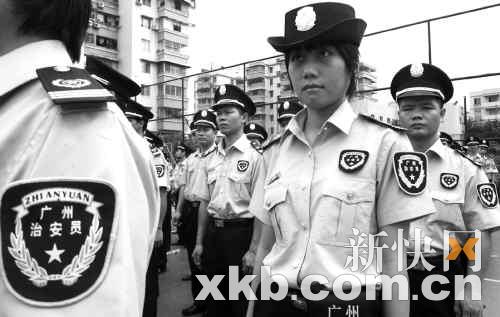 新快报讯(记者 李国辉 通讯员 姚俊南 马伟雄)8月初广州面向社会公开增招3500名治安员,时隔半月,白云区全市率先完成了增招治安员工作。昨日上午,包括40多位女性在内的400名新治安员奔赴各社区开始上岗(见上图,陈昆仑/摄)。相对于以前的治安员而言,该批新治安员的制服有明显变化,其款式、色彩酷似警服。警方有关人士表示,这是为震慑犯罪分子而进行的一种尝试。