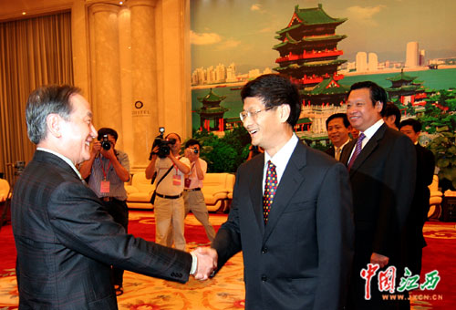 8月28日晚,孟建柱、郑立中、吴新雄在南昌会见了前来参加2007“赣台会”的台湾客人。图为孟建柱(前右)和新党主席郁慕明(左)亲切握手。(中国江西新闻网 邓小勇 摄)