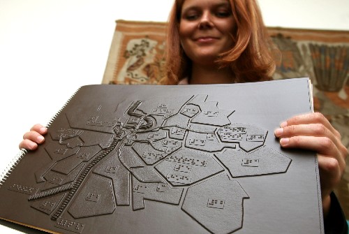 盲人地图 光明网-光明日报 2007.08.2906:36 关注 8月27日,盲人地图制作者在捷克首都布拉格展示自己的作品。这种盲人地图由塑料制成,利用点、线、面组成的立体图案向盲人和视力不佳者展示了布拉格的地形分布。据制作者介绍,她还用此方法创作了捷克其他多个城市的地图。新华社/捷通社