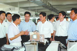 图为李铁映在有关领导陪同下,到海城东越制衣有限公司视察。