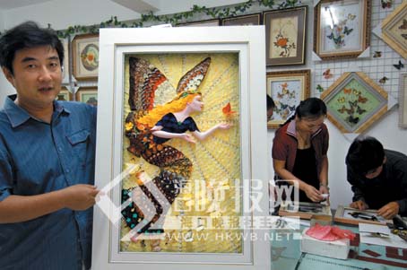 在一间工作室里,墙上挂满了各种大小镜框,蝴蝶标本能一眼看出来,其他一些立体浮雕状的作品却一时辨不出是何种画派。经介绍,这些作品原来是用一片片蝴蝶的翅膀贴出来的,蝴蝶的种类多种多样,因此图案组合也就千变万化。在工作台上,工艺美术师大豪正赶作一幅名为“花仙子”的蝴蝶画,除了花仙子的脸和手臂是用石膏塑成的外,其他衣裙、景色等都要靠蝴蝶翅膀来装点。大豪说,创作这幅画用了蝴蝶3000多只种类达30多种,历时半个多月;另外一幅“春仙花神”规模更大,用了蝴蝶4000多只近50种,日前已被西安的一家博物馆收藏。