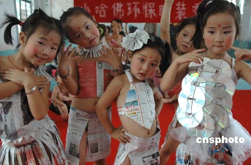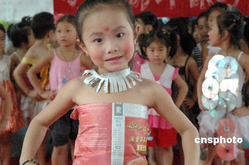 9月3日,河南省社旗县一幼儿园的小朋友为家长们表演了一场自编自导的“节能环保时装秀”。为使节能减排成为社区、家庭、及每个社会成员的自觉行动,这些聪明可爱的小朋友在老师的指导下,用废弃的塑料袋、纸杯、广告纸等材料制作成环保时装进行宣传表演,以此调动全社会参与节能减排的积极性。中新社发 宋同杰 摄