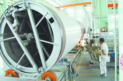 图:具有“挤出缠绕无焊缝“技术的设备正在生产塑料储罐。