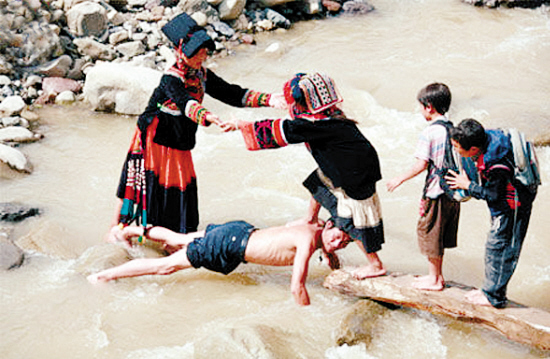 5日,一张乡村教师的特写照片迅速在网络上流传开来:在四川省凉山彝族自治州美姑县,由于洪水冲断了学生每天过往的小桥,一位中年乡村教师趴在河中,把自己的脊背当做桥梁给学生踩,把孩子们一个一个送到对岸。