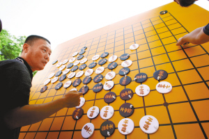 巨型棋盘上挑战五子棋 新京报 新京报官方账号 2007.09.1001:22 关注 2米见方的大型五子棋棋盘矗立在小区花园中,大家在比试棋艺。昨日,海运仓举行居民五子棋比赛,30余名居民站在棋盘前现场较量棋艺。本报记者 林阿珍 秦斌 摄影报道