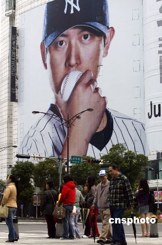 资料图:台北西门町街头的台湾著名棒球选手王建民的巨幅广告格外醒目。目前效力于美国著名职业棒球队纽约洋基队的王建民被誉为“台湾之光”。投球手王建民自打入美国职业棒球联赛以来,不断创出辉煌战绩,成为耀眼的棒球明星、台湾“万人迷”。中新社发 张炜 摄