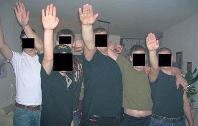 搜查人员在嫌疑人家中发现了一张照片,一名成员一手持枪、一手拿着写有“你好希特勒”的标语。此外,警方还收缴了一些武器、刀具以及爆炸物等。
