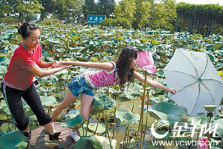 据了解,近段时间,景区迎来了入秋后的旅游高峰。部分游客贪恋莲籽的清香,无视景区的管理规定采摘莲蓬。不少荷塘的莲蓬变成了“半秃顶”。记者前天在荷花世界看到,靠近岸边或赏荷台的莲蓬几乎荡然无存,只剩下长长的莲梗。在冬荷区,几名女游客从赏荷小径步入荷塘深处,看到又大又圆、莲籽成熟的莲蓬就想方设法采下来,手不够长就用雨伞勾到身前,再采摘……