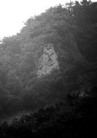 图:薄雾中的“石人面”。 记者 杨奇 摄