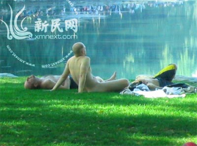 根据网友上的帖子,三名身材高大的白人男子躺在颐和园湖边的草坪上休憩。一人上身赤裸,一人穿一条内裤,另一人则一丝不挂,全身赤裸。三人将衣服扔在一旁。从湖水的倒影中可以看到,当时颐和园内游人众多。照片上显示,就在三名外国游客几米远处,有不少游人驻足观看。