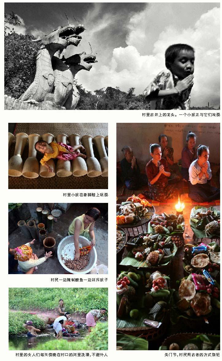 耸入云霄的望天树,碧绿的稻田,把曼旦村包围在正中央。80座干栏式木屋,400人口,乡村便道腰带似的环绕着村落。便道两旁,流水潺潺,熟透了的瓜果沉甸甸地挂在枝头,刚下过雨的泥土散发着芬芳。村西头的寺庙里,气定神闲的和尚们倚着柱子,注视着我们这些外来者。