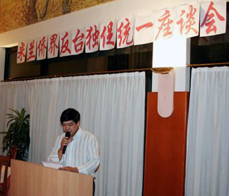 中新网9月14日电 据意大利《欧联时报》报道,日前,米兰华侨华人工商会、旅意北部青田同乡会、旅意北部瑞安同乡会、米兰华侨华人企业家联谊会、米兰温州华侨华人商会等侨团联合举办座谈会,强烈谴责台湾陈水扁政府不顾两岸同胞的利益,推动所谓“入联公投”和“以台湾名义加入联合国”分裂祖国的行径。