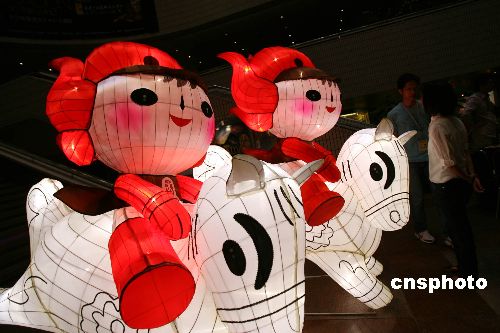 香港文化中心大堂装饰福娃花灯,为即将举行的中秋彩灯会作宣传。中新社发 洪少葵 摄
