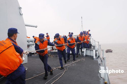 9月18日,据气象和防汛部门预测,2007年第13号强台风“韦帕”中心最大风力达45米/秒(14级),由于其强度强、范围大、降水多,其影响程度将超过2005年的“麦莎”和“卡努”台风,成为自1997年以来影响东海最严重的一次台风。东海舰队某支队扎实抓好防抗台风工作,他们积极通过开展“港岸练部署、海上练实作”活动,不断提高舰艇部队防抗台风的快速反应能力。中新社发 毛昭胜 摄