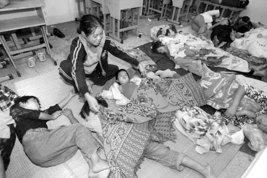 群众在休息 温州都市报 温州都市报官方账号 2007.09.1915:31 关注 9月18日晚,瑞安市塘下镇鲍田中心小学,转移到此处的群众在休息,该小学接纳了700多位从低洼及其他危险地带转移过来的群众。该镇总共转移群众1.3万多名。这些群众大都是来是贵州、河南等地的新温州人。本报记者郑鹏 摄