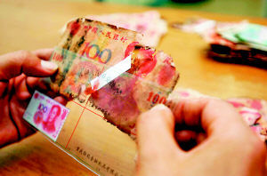 “真可惜呀,由于对霉变纸币的处理方式不正确,大部分纸币都残破得不能兑换了。”中国银行沙坪坝支行工作人员,对这些残币清查后表示,兑换残币需按照《中国人民银行残缺污损人民币兑换方法》严格执行。支行总出纳挨张细心审核残币,两小时后对其中55张残币进行了兑换,总额3350元。