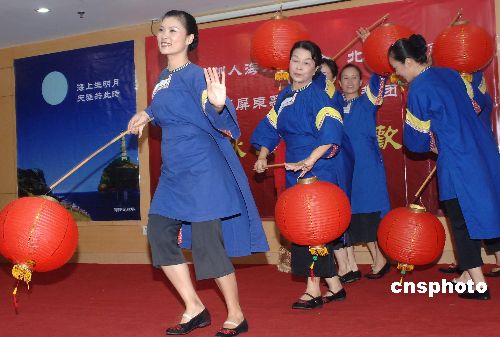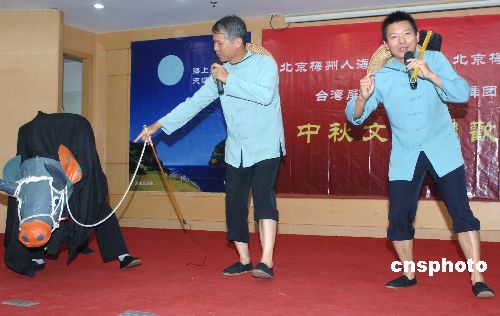 9月22日,台湾屏东县“蓝衫乐舞团”、北京梅州人海外联谊会、北京梅州商会在北京华文学院共同举行客家人庆祝中秋文艺联欢会。台湾屏东县“蓝衫乐舞团”此次到大陆演出得到屏东市官员的支持和资助,演出受到北京客家人的赞赏。中新社发 邹宪 摄